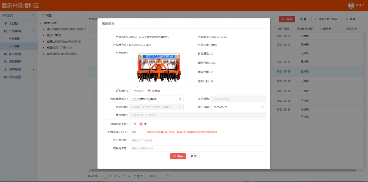 - 作業(yè)項目:為播種機(農機)生產廠家和播種機(農機)經銷商提供作業(yè)項目跟蹤服務的功能。