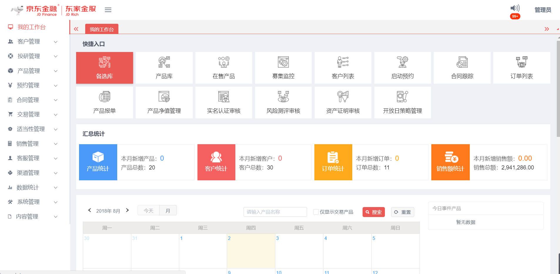 - 我的工作臺:提供系統(tǒng)菜單快捷入口,統(tǒng)計核心業(yè)務(wù)數(shù)據(jù)及開放期內(nèi)的產(chǎn)品日歷事件展示