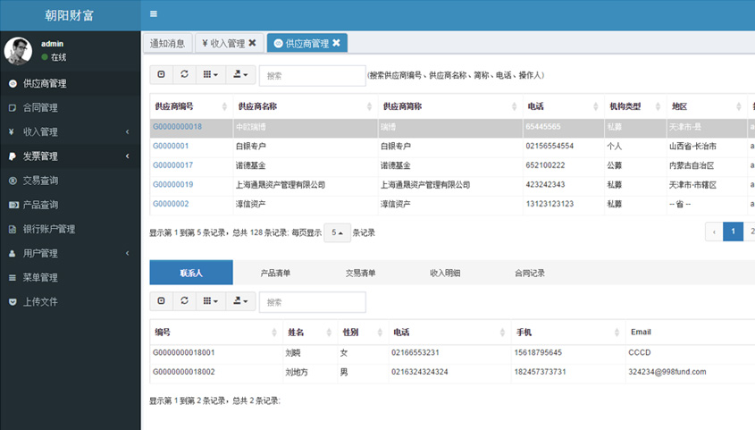 - 供應商管理: 供應商信息管理,包括交易、收入、聯系人、產品等