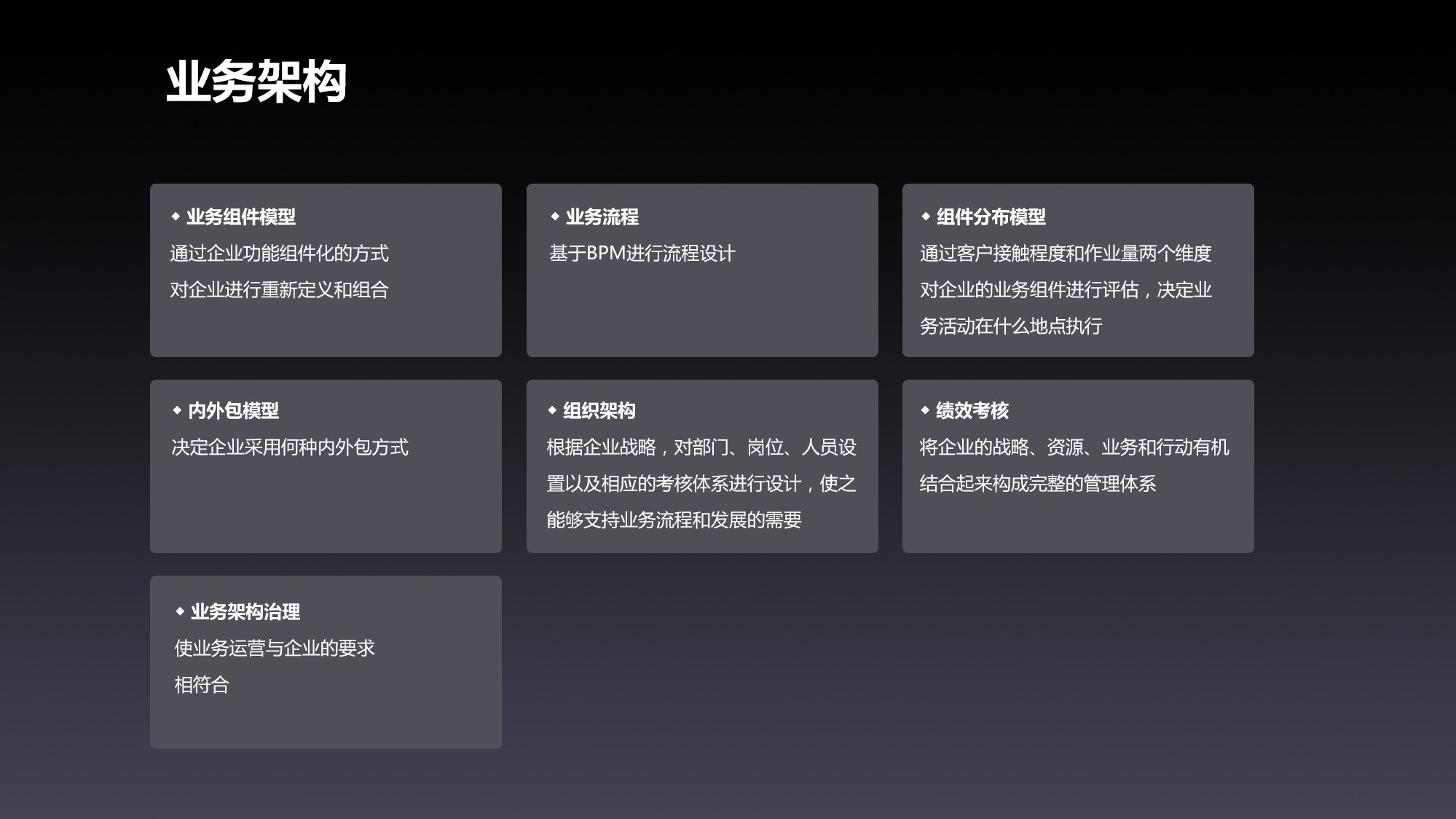 基于BPM設(shè)計業(yè)務(wù)流程,結(jié)合管理層ARC - ERP系統(tǒng)與“樞理”數(shù)據(jù)治理,梳理、優(yōu)化流程,消除冗余環(huán)節(jié),提升運轉(zhuǎn)效率;借組件分布模型,從客戶接觸程度和作業(yè)量維度,評估業(yè)務(wù)組件,合理規(guī)劃業(yè)務(wù)活動執(zhí)行地點,降低運營成本;以內(nèi)外包模型,科學(xué)決策業(yè)務(wù)外包方式,聚焦核心競爭力;依據(jù)戰(zhàn)略設(shè)計組織架構(gòu),適配部門、崗位、人員及考核體系,為業(yè)務(wù)流程筑牢組織支撐;通過績效考核,串聯(lián)戰(zhàn)略、資源、業(yè)務(wù)與行動,構(gòu)建完整管理體系;依托業(yè)務(wù)架構(gòu)治理,確保業(yè)務(wù)運營貼合企業(yè)要求,讓戰(zhàn)略落地“看得見、摸得著”。